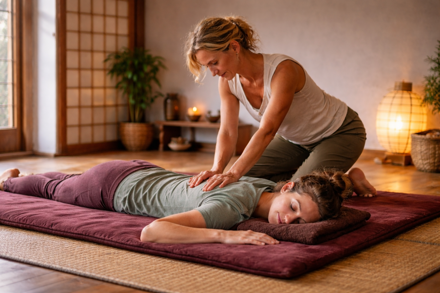 Zen-Shiatsu ist ein eigenständiges System energetischer Körperarbeit, das auf den Meridianen, dem Konzept von Ki/Qi, Yin und Yang sowie den fünf Wandlungsphasen beruht. Behandelt wird am bekleideten Körper auf einer Matte oder Liege mit ruhigem Lehnen, Dehnungen und Rotationen entlang der Energiebahnen. In der Frauenheilkunde nutze ich Zen-Shiatsu, um Spannungsmuster im Körper, die sich z. B. im Zusammenhang mit Zyklus, Belastung und hormonellen Veränderungen zeigen, direkt über die Berührung anzusprechen. Die achtsame, klare Berührung bezieht körperliche, emotionale und mentale Ebenen mit ein und unterstützt die Selbstregulation, indem sie den Energiefluss fördert und Ungleichgewichte zwischen Fülle (Jitsu) und Leere (Kyo) anspricht. Viele Patientinnen erleben Shiatsu als Möglichkeit, Spannungen wahrzunehmen, loszulassen und wieder besser mit den eigenen Ressourcen in Kontakt zu kommen.
